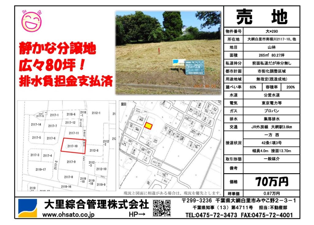 大網白里市南横川 売地 大290