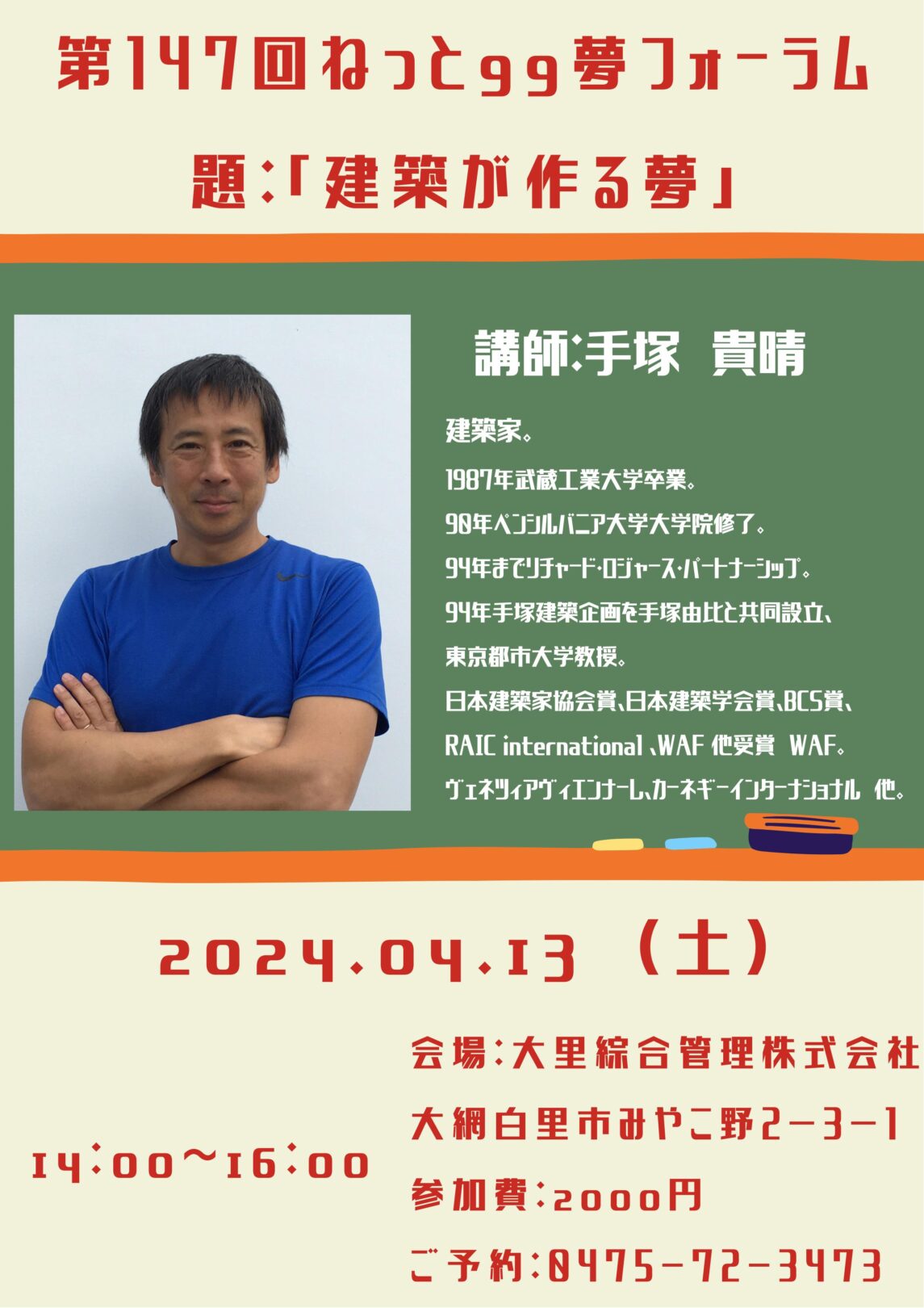 4月13日(土) ねっと99夢フォーラム「建築が作る夢 講師:手塚 貴晴 氏」
