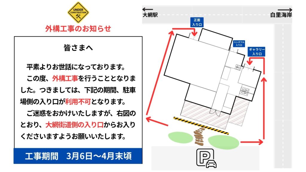 この度、大里にて外構工事を行うこととなりました。つきましては、3月6日から4月末頃まで、駐車場側の入り口が利用不可となります。