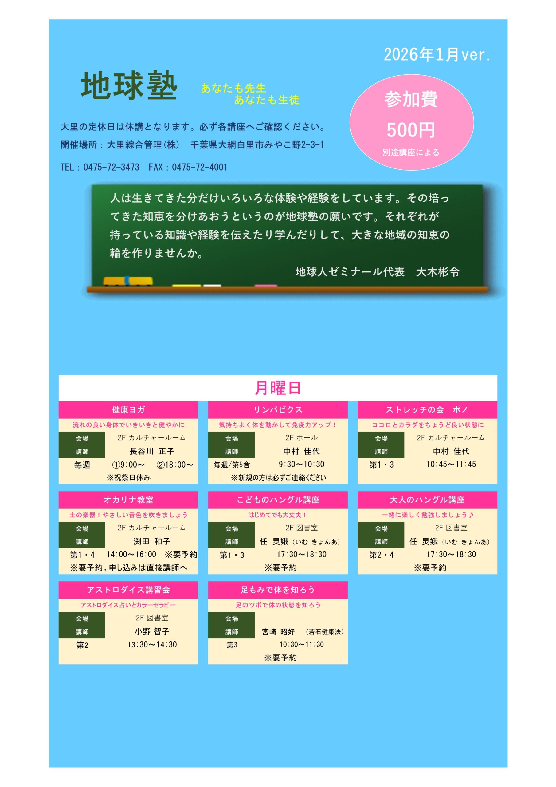 地球塾の初回申込、体験、見学をご希望のお客様は事前に日時のご確認を直接お電話にてお願いいたします。